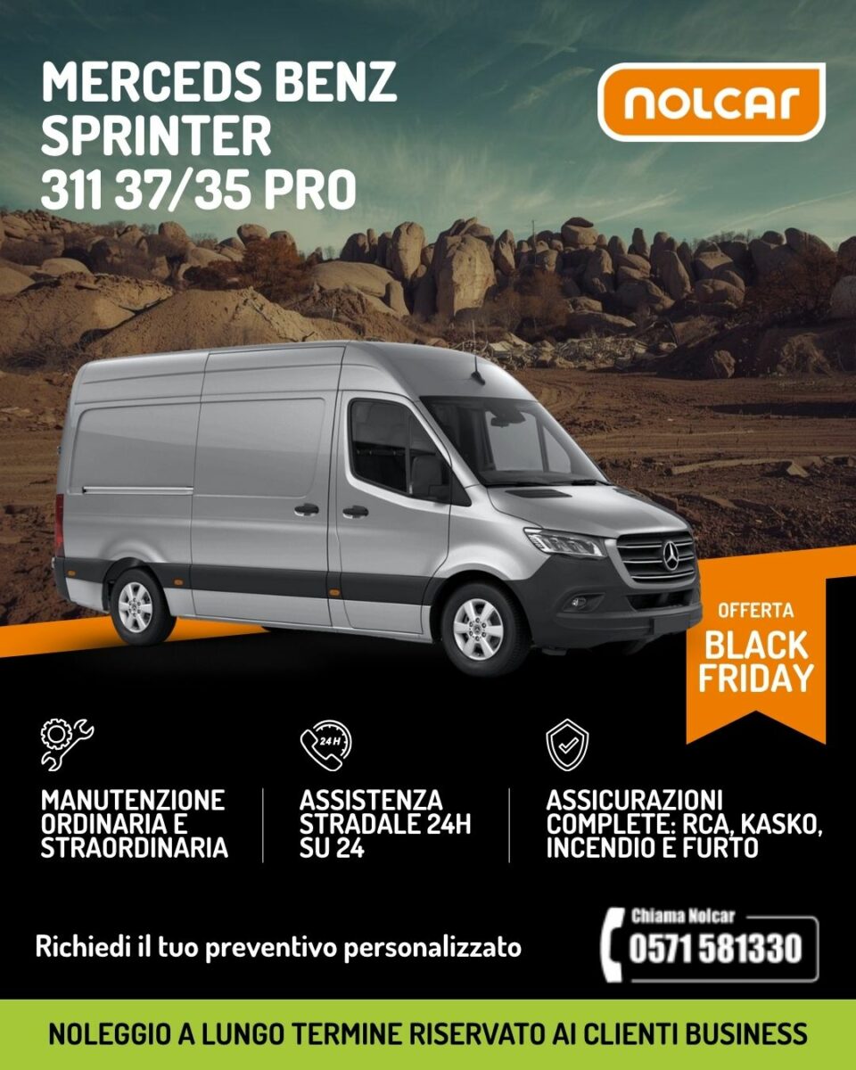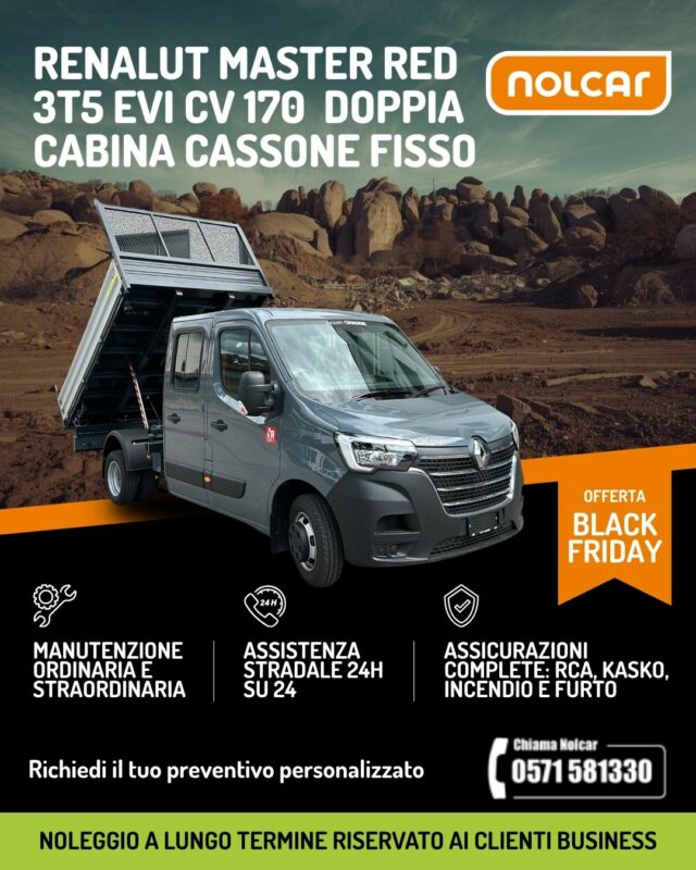 Approfitta delle Promo BLACK FRIDAY NOLCAR*. Van e MMT a noleggio a lungo terra a condizioni imperdibili. Incluso: – Manutenzione ordinaria e straordinaria – Assicurazioni RCA, KASKO, Incendio e Furto – Assistenza stradale 24 ore su 24